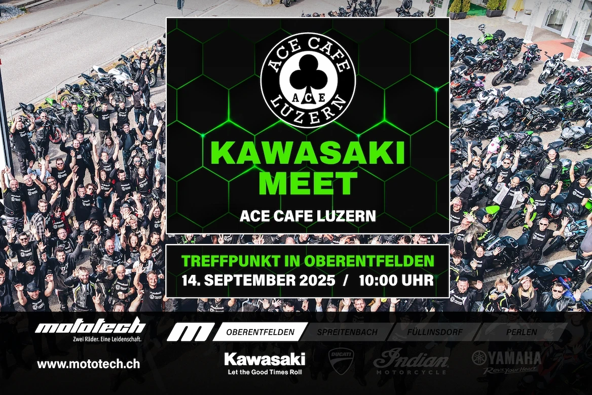 👉 The meeting point is at Moto-Tech Schweiz AG in Oberentfelden. From there, we'll set off together on a group ride to the Ace Cafe Lucerne - a legendary place for cool bikes, delicious food and the best Kawasaki community in Switzerland.