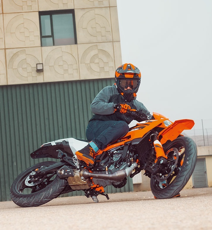 Upright riding position, wide handlebars and full control - this is exactly how Supermoto should be.